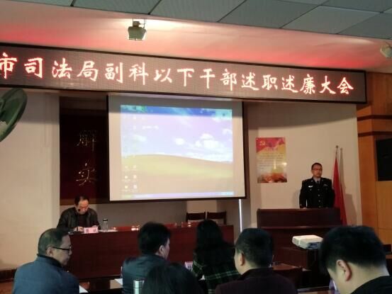 3月22日下午,市司法局召开副科以下干部述职述廉大会,11名副科及以下干部先后对过去一年所做的工作和个人廉洁自律情况进行了汇报。汇报中,既有口头汇报,也有图文并茂的PPT汇报,还有工作掠影专题片汇报;既谈到了自己是如何配合科室(处、所)负责人开展工作的,又深刻剖析了自己工作中存在的不足,还结合科室对自己工作的安排,畅谈了自己2017年的工作打算.会上,参会的20余名科室(处、所)负责人和局领导班子成员结合11名同志的述职述廉情况进行了客观的评分。