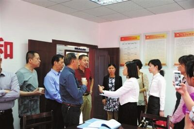 图为镇卫军(左四)等陪同公安部禁毒局领导一行调研咸安区永安街道办事处社区戒毒(康复)网格化管理工作的情景
