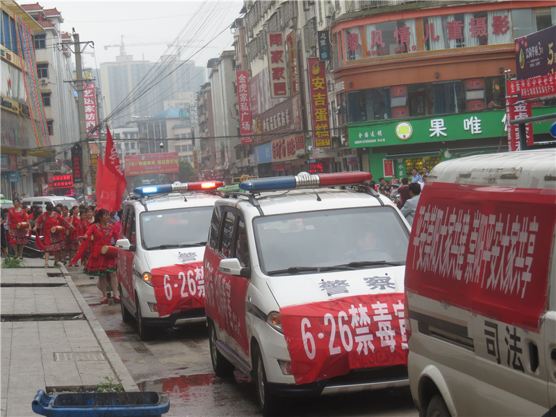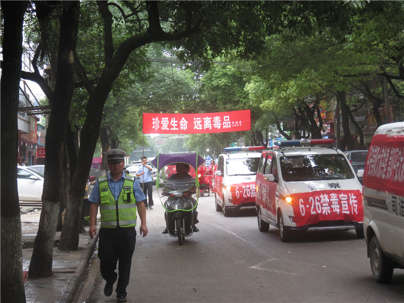 一是举行禁毒宣传游行活动。司法、公安出动警车5台组成宣传车队,邀请60人的腰鼓队,开展声势浩大的禁毒宣传游行活动,游行队伍深入城区大街小巷,利用车载广播全面讲解毒品“毁灭自己,祸及家庭,危害社会”的极大危害性,毒品直接威胁人民群众的身体健康和家庭幸福,直接影响社会稳定和经济发展,告诫人们珍爱生命,远离毒品,增强群众禁毒、防毒、拒毒的意识。