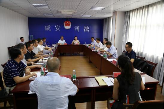 通讯员:程红兵 周慧 报道:8月3日,司法部律公司副司长施汉生、律公司公证业务处处长刘华春,省司法厅厅长谭先振等一行来咸安督察公证改革工作。区委副书记、政法委书记镇卫军,副区长、公安局局长卢卫军参加了督察、座谈活动。 督察组一行实地查看了咸安区公证处的公证办理流程,并就公证改革等情况进行了具体深入的了解。随后,在咸安区司法局召开座谈会,听取了区司法局局长徐盛斌和公证处主任程红兵关于公证体制改革工作的情况汇报。